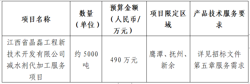 江西省晶磊工程新技術(shù)開發(fā)有限公司減水劑代加工服務(wù)項(xiàng)目(采購(gòu)編號(hào):JXYC-ZX-202304017)公開招標(biāo)公告